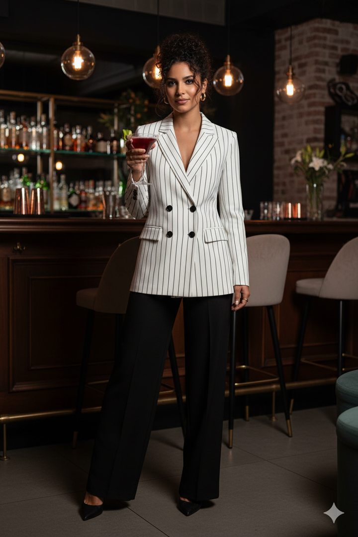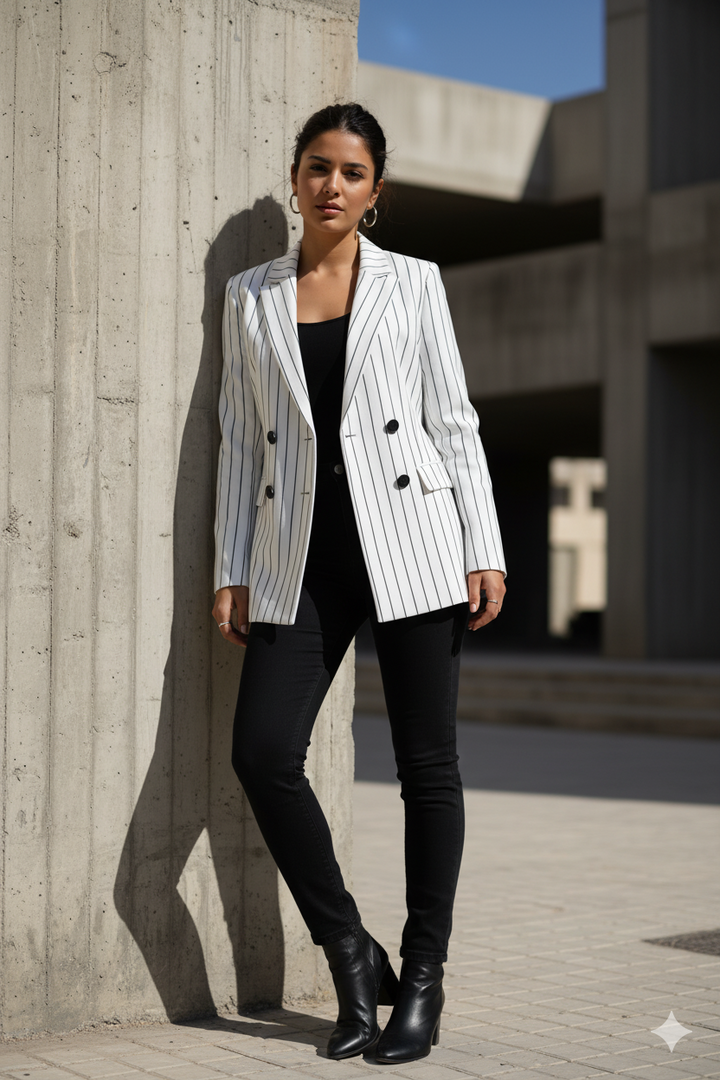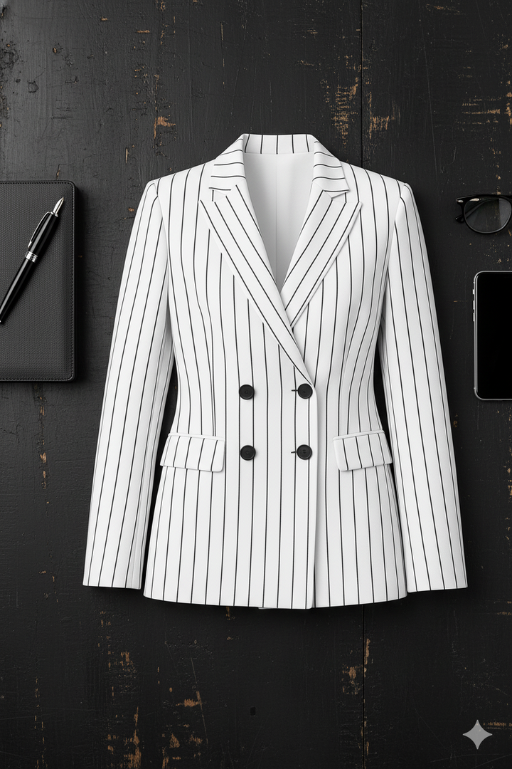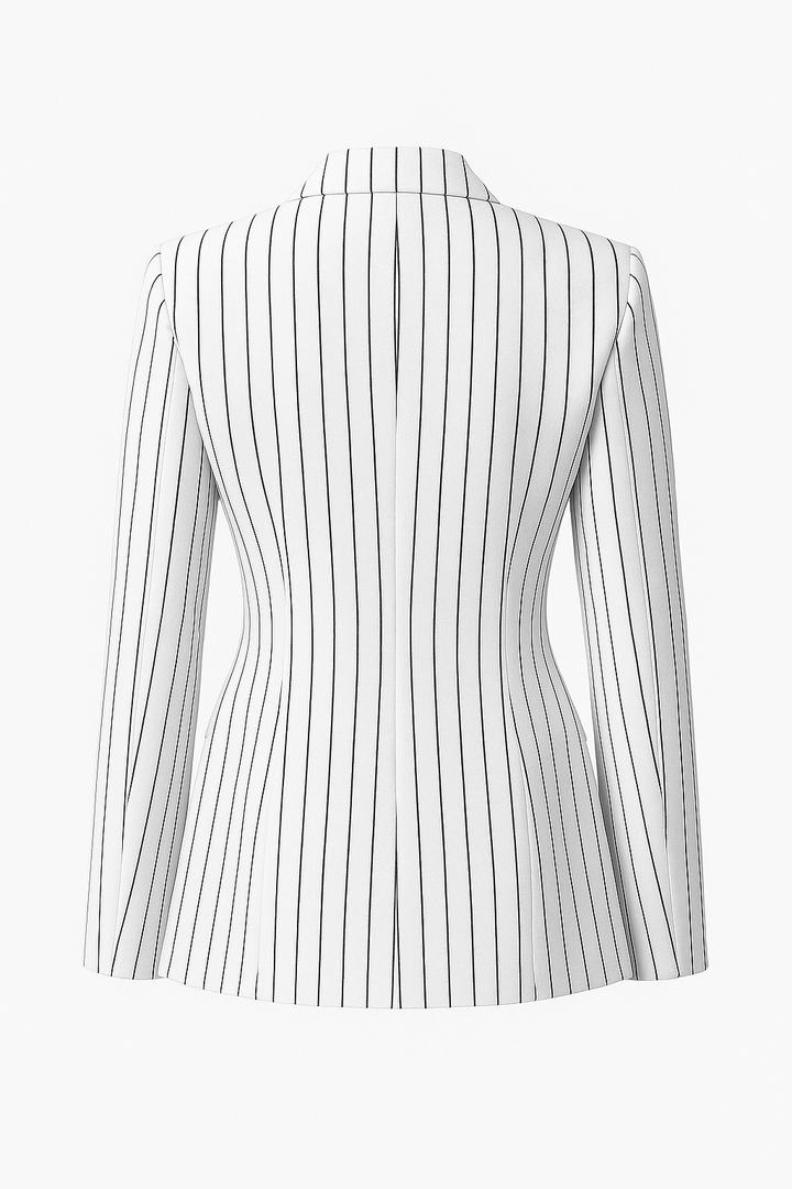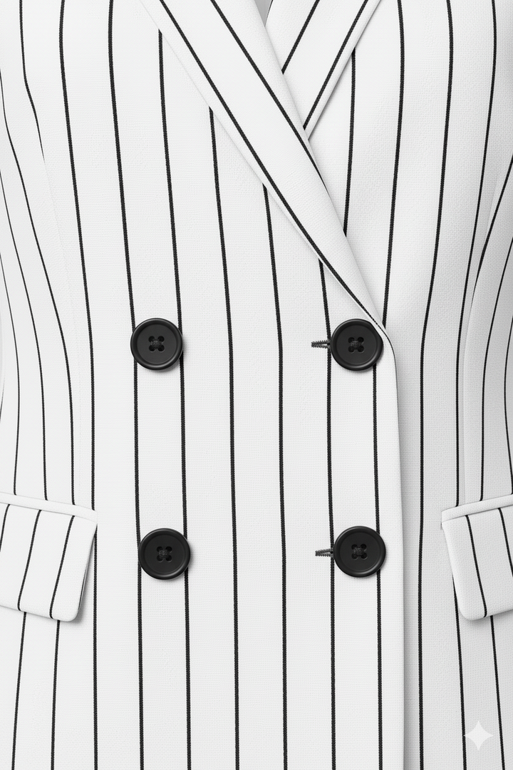 Sa coupe tailleur, impeccablement cintrée, épouse les formes pour une allure forte et féminine. La fermeture croisée à double boutonnage, signature du "power dressing", structure la silhouette, tandis que les revers en pointe acérés allongent le décolleté. Le motif iconique à rayures tennis sur fond blanc allonge l'allure avec une précision graphique, créant une pièce qui ne passera jamais inaperçue.