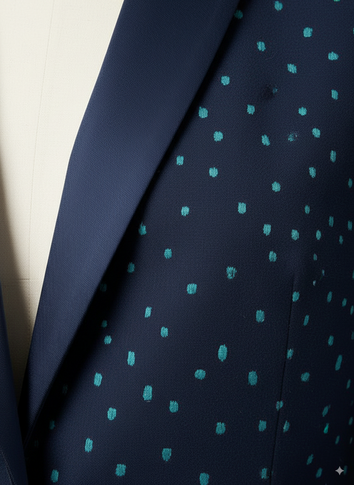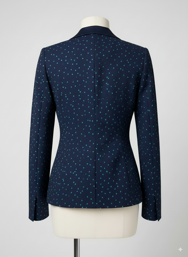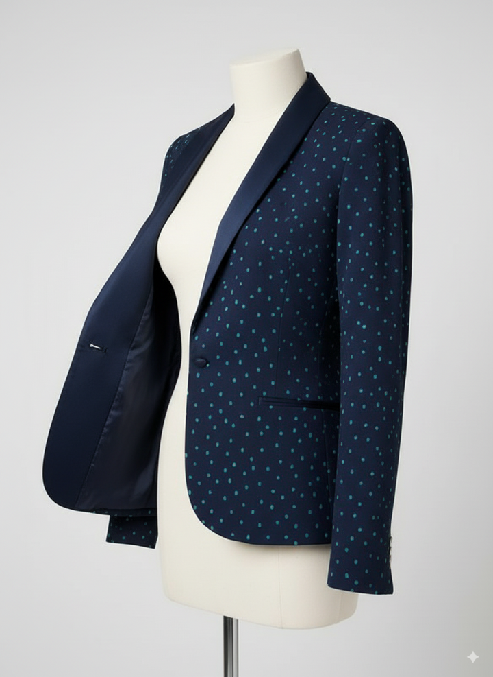 Sur un fond bleu marine profond, un motif à pois turquoise apporte une note de couleur discrète et ludique. La véritable signature de cette pièce réside dans son élégant col châle en satin contrastant, qui lui confère une allure "smoking" très raffinée. Fermé par un unique bouton perlé qui agit comme un bijou, ce blazer structuré est la définition même du chic moderne.