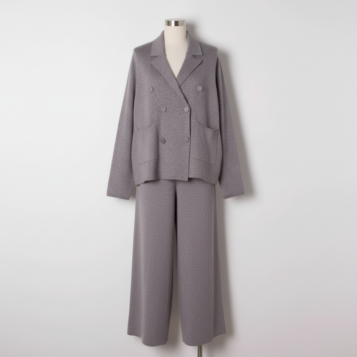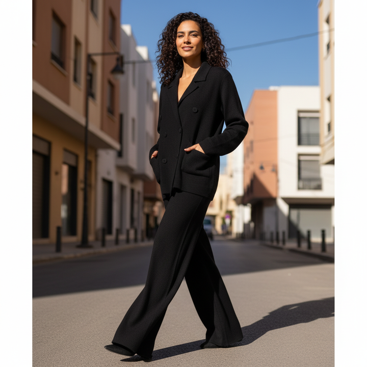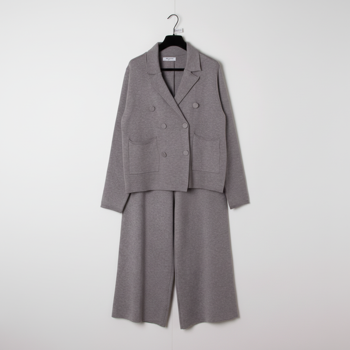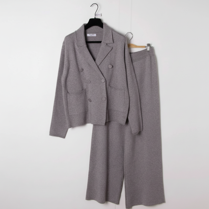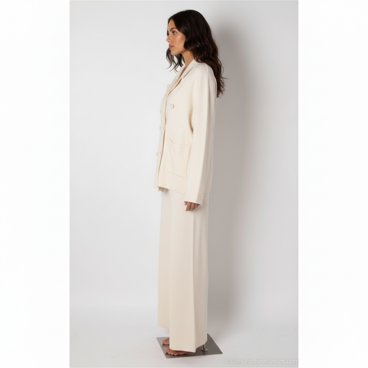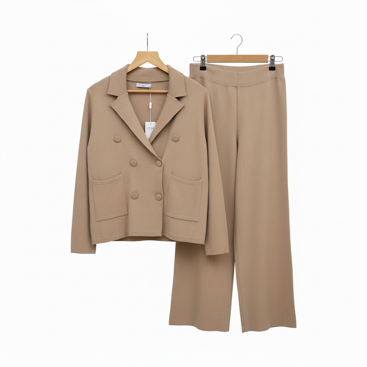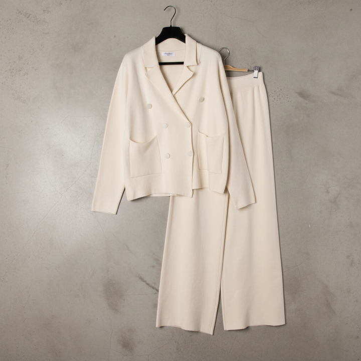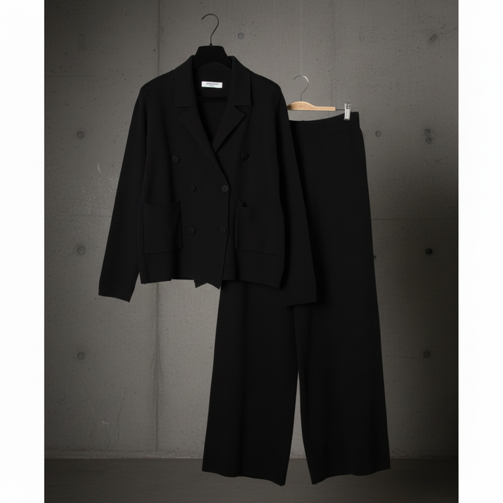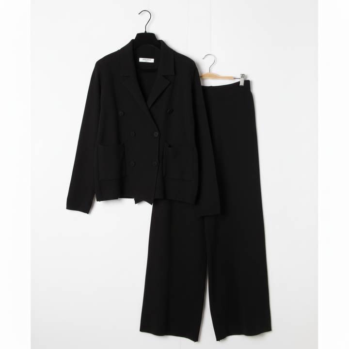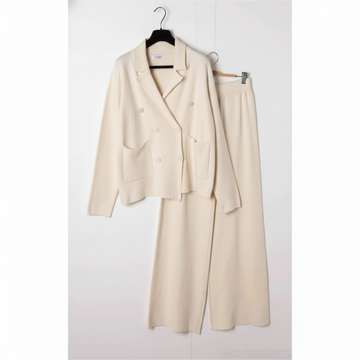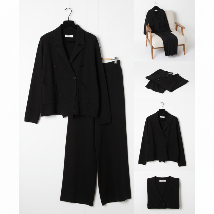 Cet ensemble deux pièces associe une veste croisée et un pantalon large en maille douce pour un style chic et confortable pendant la saison froide. Idéal pour le bureau, les sorties ou un look city élégant.