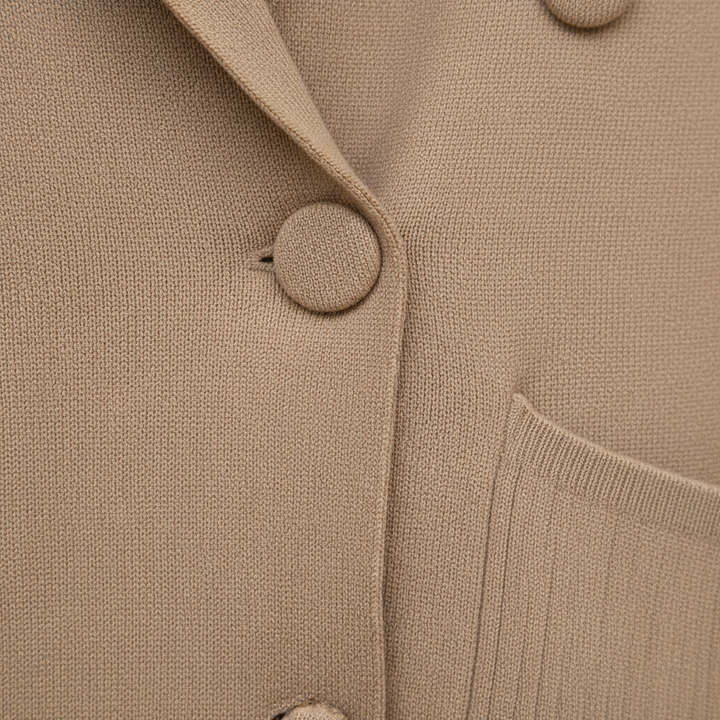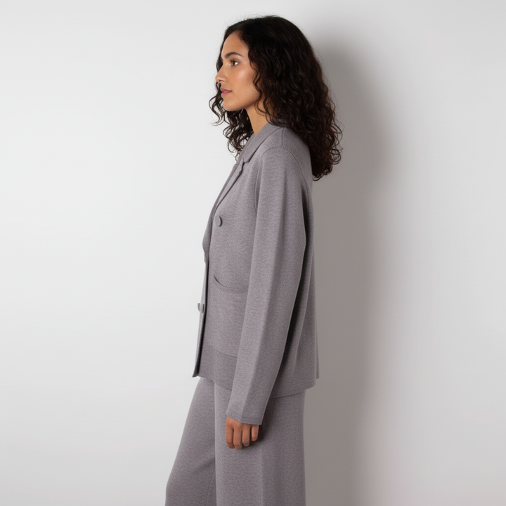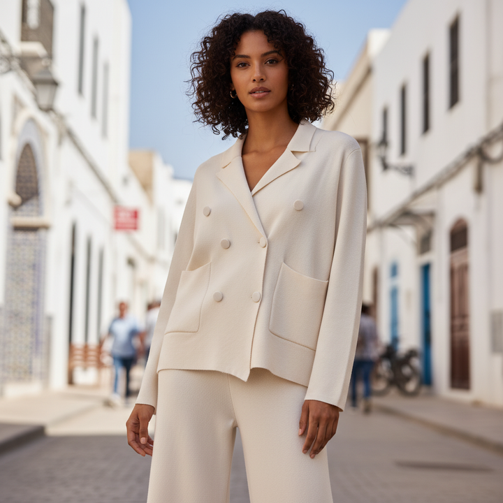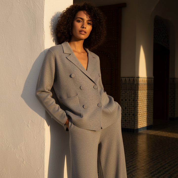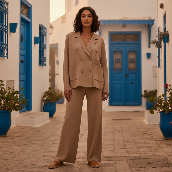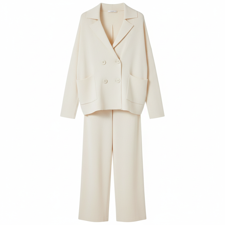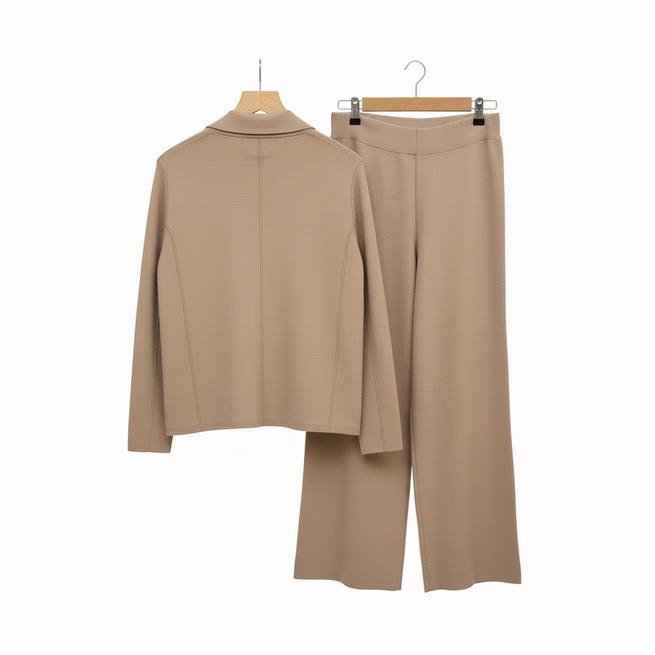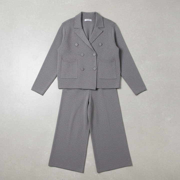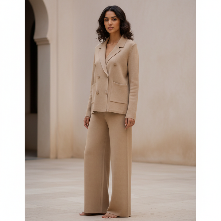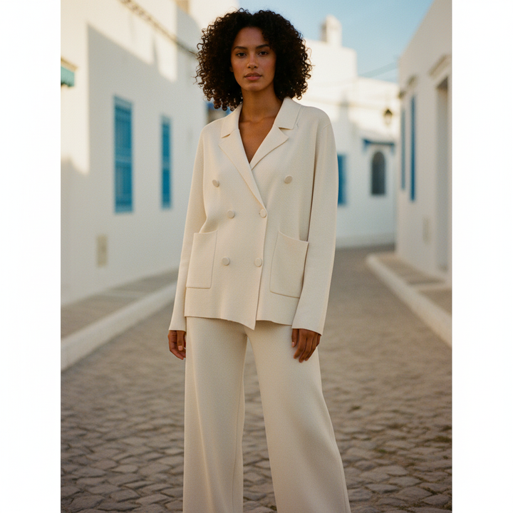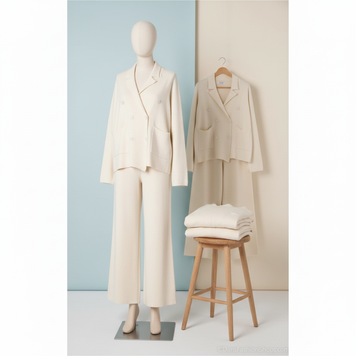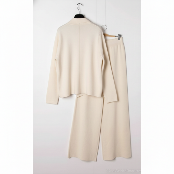 Cet ensemble deux pièces associe une veste croisée et un pantalon large en maille douce pour un style chic et confortable pendant la saison froide. Idéal pour le bureau, les sorties ou un look city élégant.