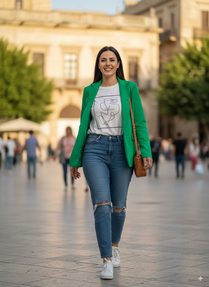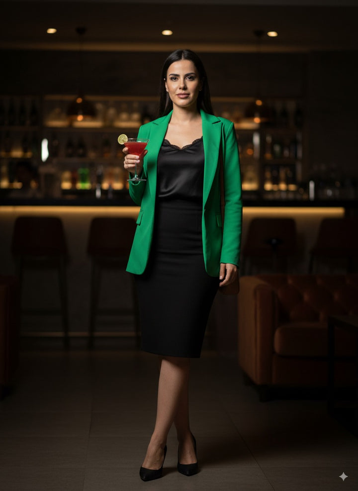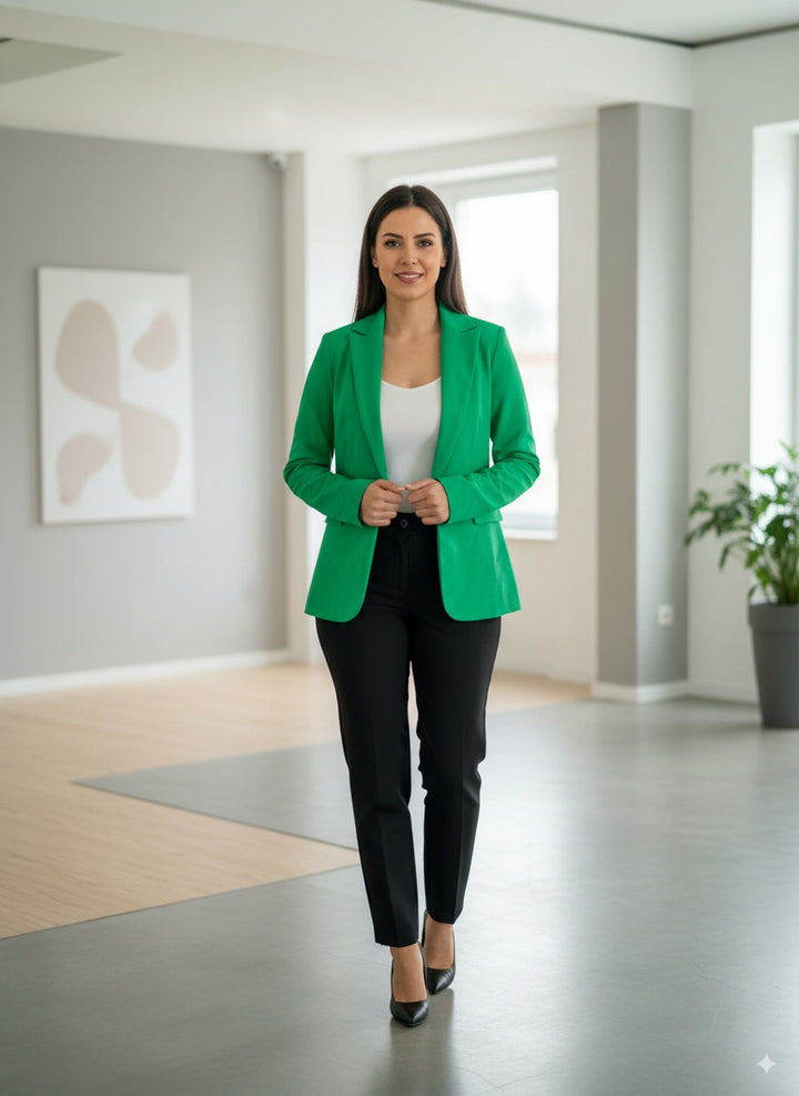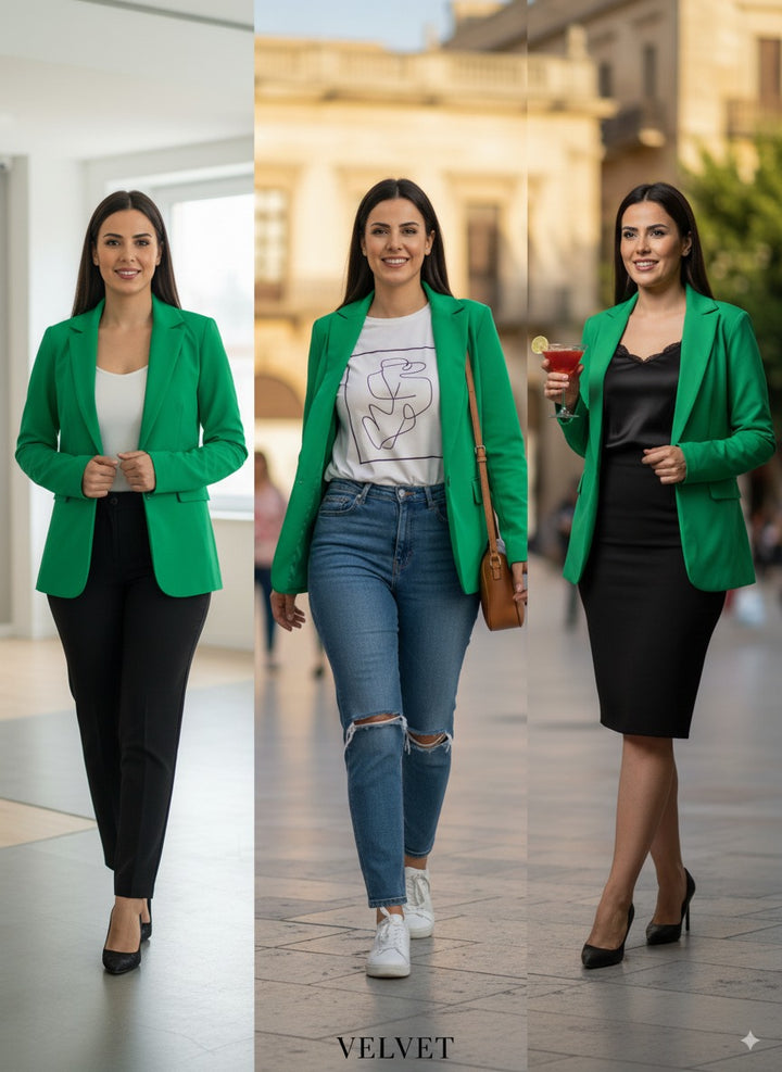 Le Blazer Élégance Émeraude est la pièce maîtresse d'une garde-robe audacieuse et polyvalente. Pour une réunion d'affaires, associez-le à un pantalon noir fuselé et des escarpins nude. Pour une sortie décontractée chic, il sublimera un jean brut et un t-shirt blanc impeccable. N'hésitez pas à jouer avec les accessoires dorés pour en rehausser l'éclat. Avec Velvet, l'élégance est une invitation à s'affirmer.
