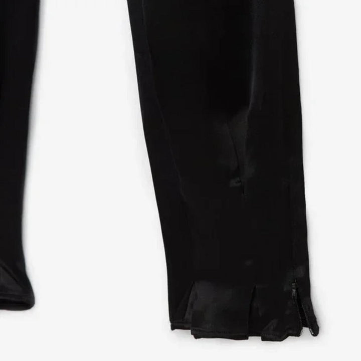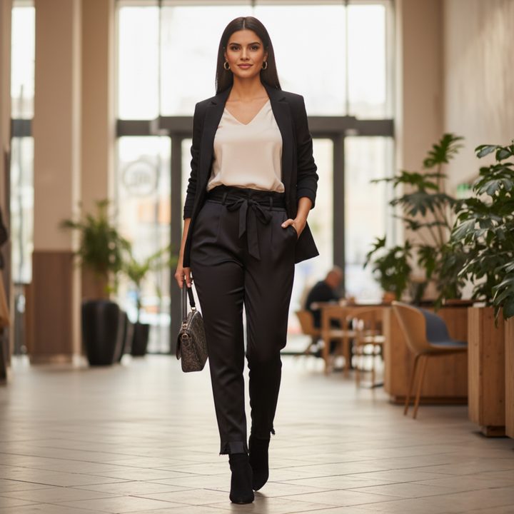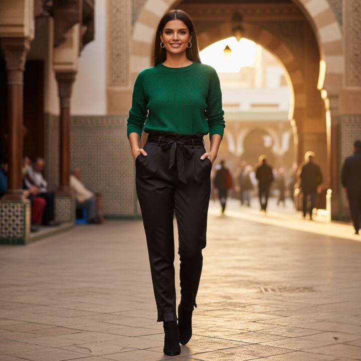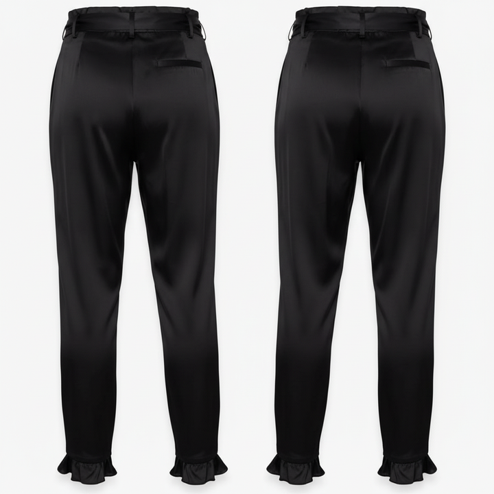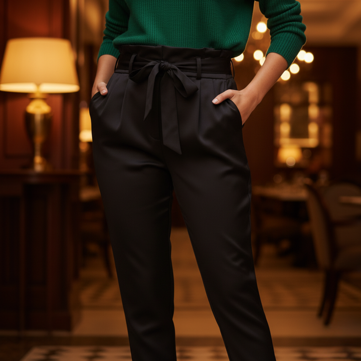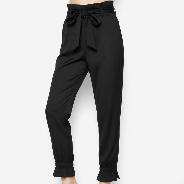 Des détails raffinés : Une taille haute ceinturée et des chevilles resserrées pour une allure sophistiquée.