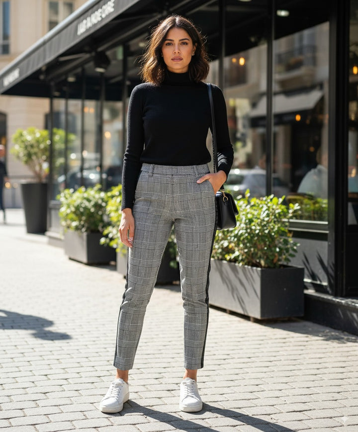 Pour une allure plus pointue : Associez-le à un col roulé noir ajusté, un blazer et des bottines à talons.