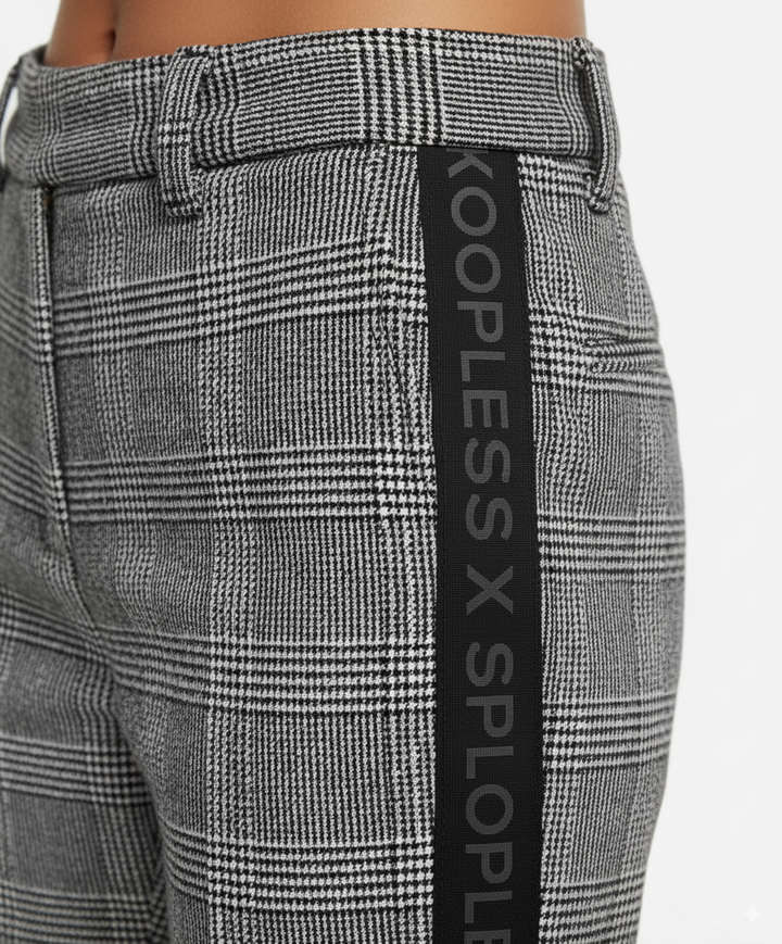 Sur la base intemporelle d'un motif Prince de Galles, nous avons ajouté un détail qui change tout : une bande latérale noire d'inspiration sportive, qui allonge la jambe et apporte une touche graphique et dynamique. Sa coupe droite, décontractée et confortable, en fait une pièce facile à vivre, tandis que sa taille haute et ses poches passepoilées au dos conservent les codes d'un pantalon de tailleur bien coupé.