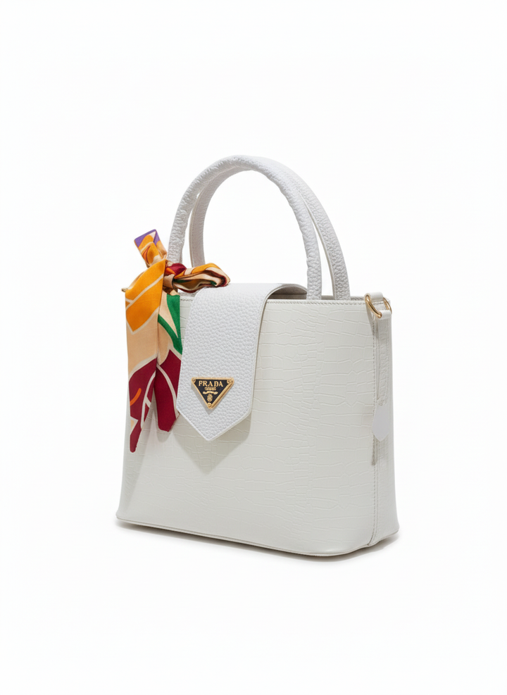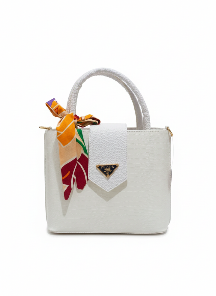 - Accessoires : Écharpe en soie imprimée + anneaux pour bandoulière