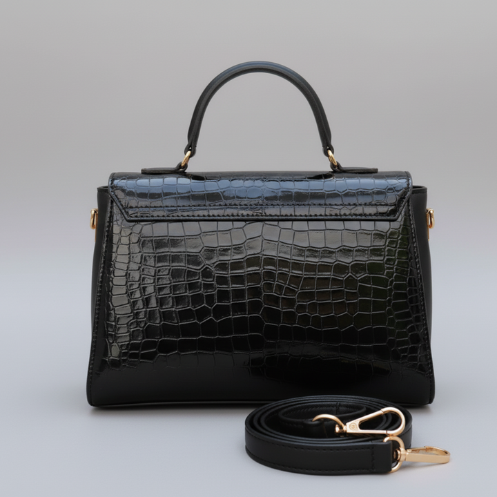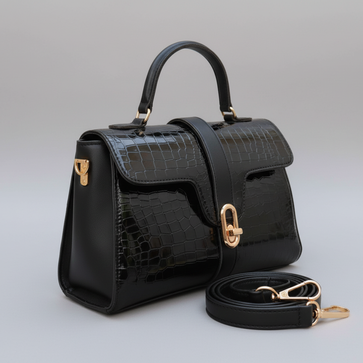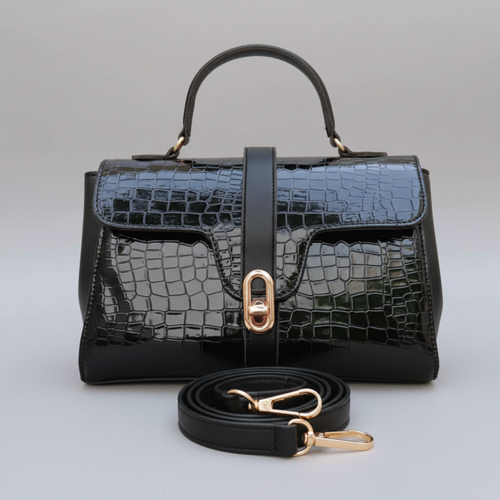 Son allure intemporelle est sublimée par un similicuir verni à l'audacieux motif crocodile, qui capture la lumière et attire le regard. Sa silhouette structurée et rigide est parfaitement équilibrée par des finitions délicates en métal doré, comme son fermoir rotatif et les attaches de sa bandoulière. Conçu pour la femme moderne, il est aussi fonctionnel qu'élégant.