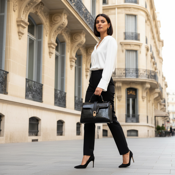 Comment le porter ? "Le Trocadéro" est d'une polyvalence absolue. Il est le compagnon idéal d'un tailleur pantalon pour une journée au bureau, sublime une robe de cocktail pour une soirée, et apporte une touche d'élégance instantanée à un simple duo jean et blazer.