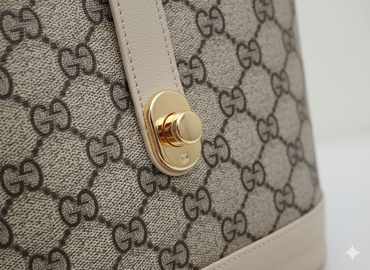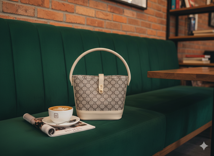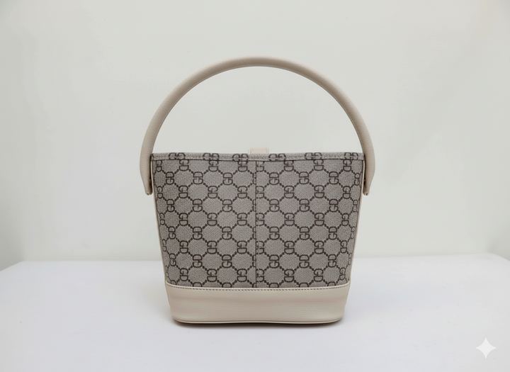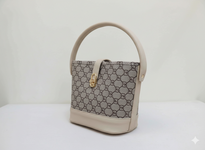Sa silhouette structurée en forme de seau est habillée d'une toile de haute qualité, ornée d'un motif monogramme iconique et intemporel. Les finitions en similicuir beige, notamment la base robuste, l'anse arrondie et la patte de fermeture, apportent un contraste élégant et une touche de raffinement. Le fermoir rotatif doré ajoute une note précieuse et sécurise vos essentiels avec style.