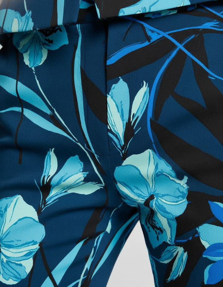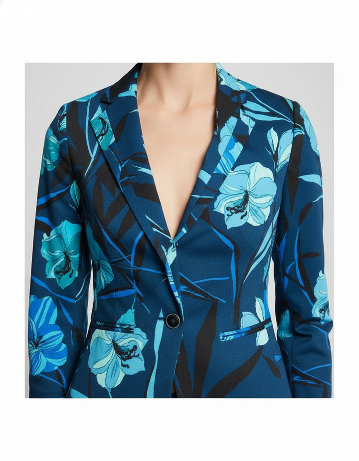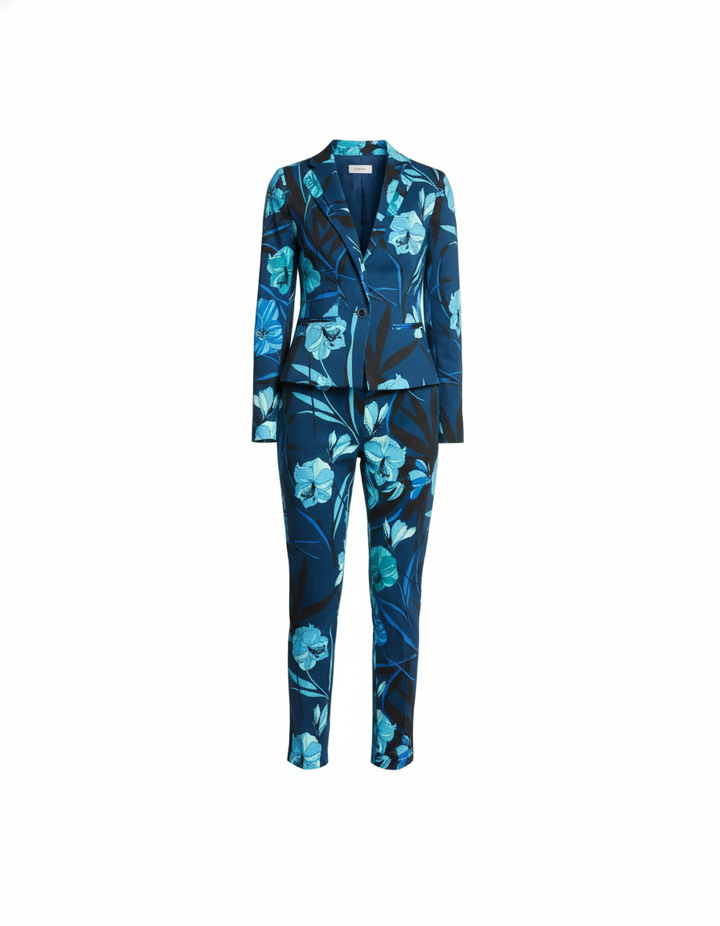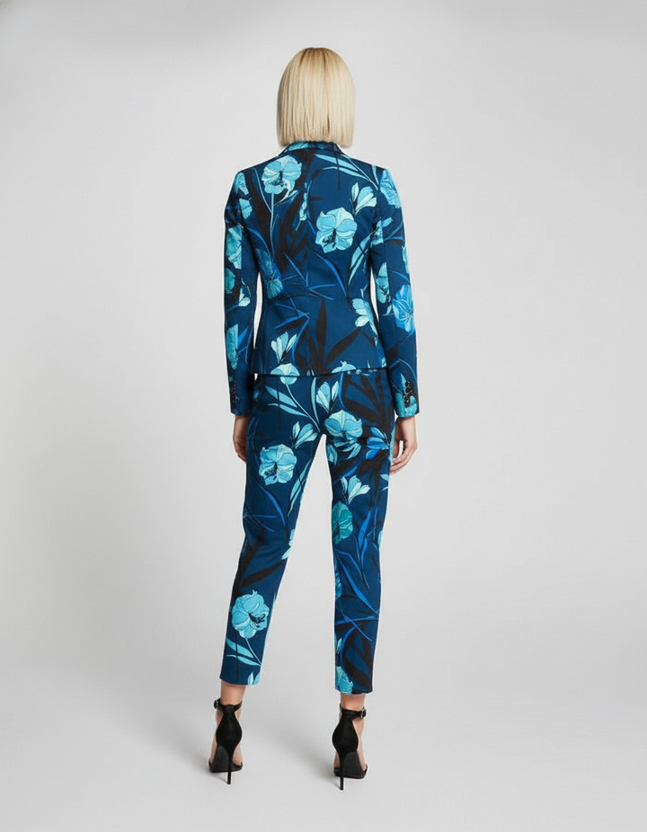 Imprimé Végétal Bleu Audacieux : Affirmez votre personnalité. Les nuances de bleu marine et turquoise offrent un contraste saisissant, prouvant qu'un tailleur peut être vibrant et parfaitement adapté au monde professionnel moderne.