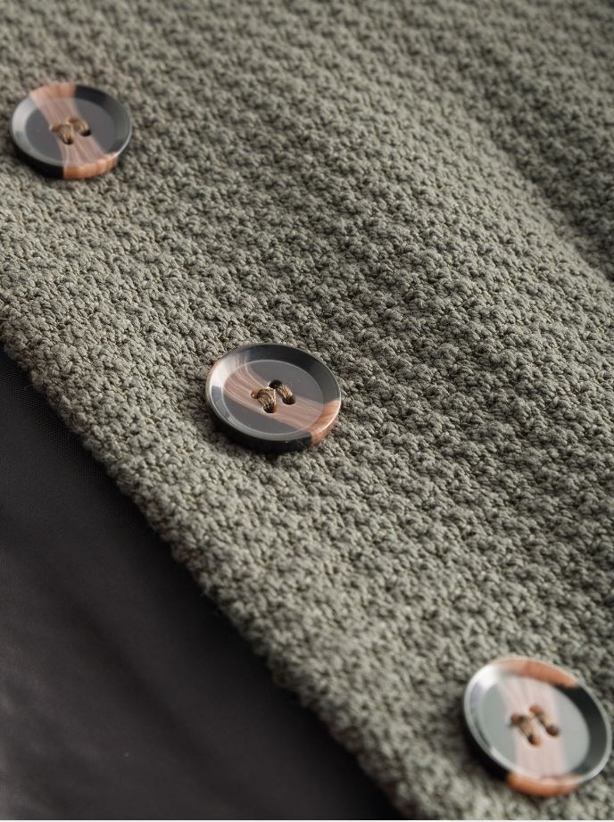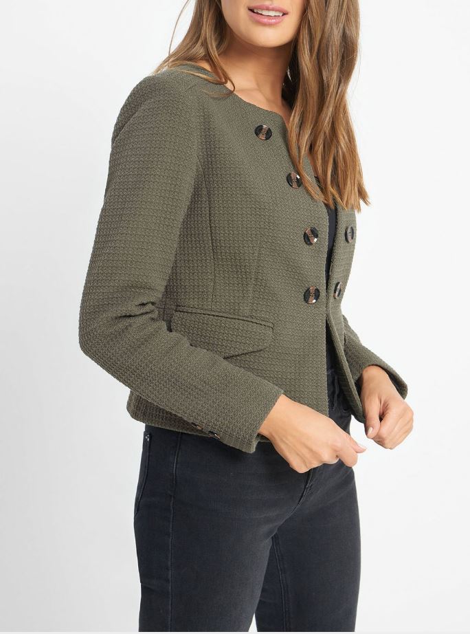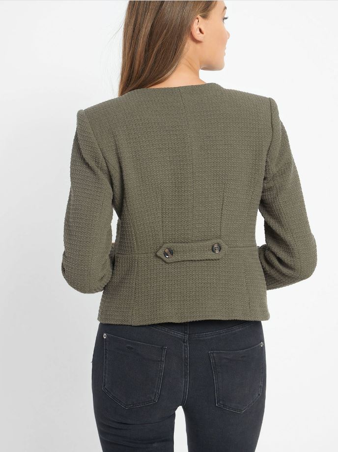 La veste "Signature" est conçue pour celles qui ne veulent aucun compromis entre style et confort. Elle capture l'œil avec son tissu texturé (gaufré) unique et sa couleur kaki profonde, la teinte la plus tendance de la saison.